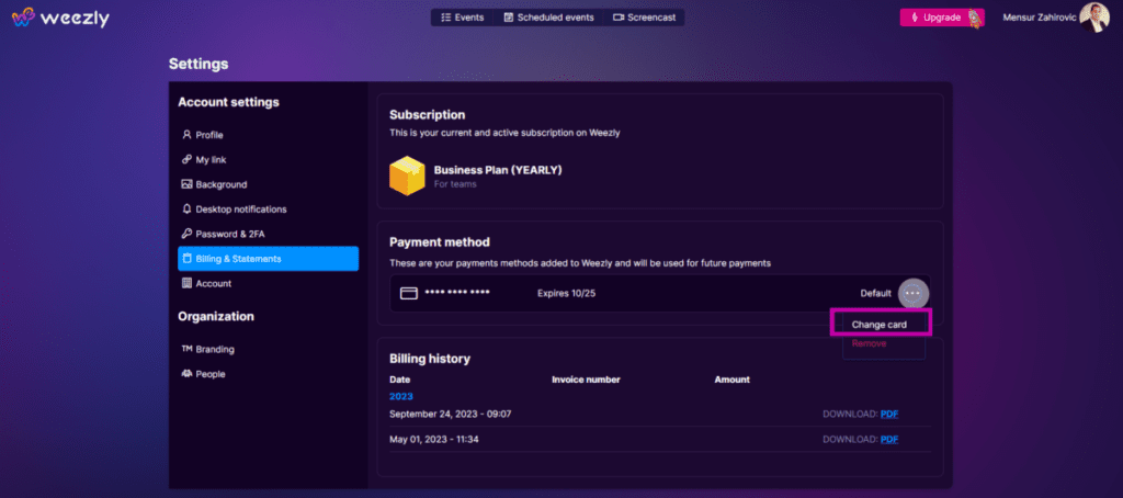 How to modify billing and payment details in Weezly?