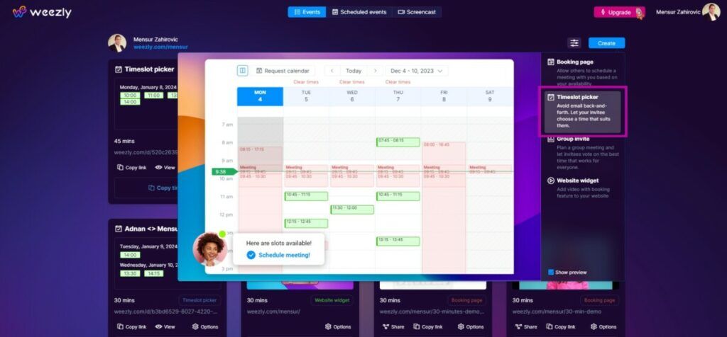 This is where the magic happens. With Weezly’s Timeslot Picker, you have the flexibility to: set specific working hours, block outbreaks or personal commitments, share your availability with others, and see your colleague’s calendar (shared calendars feature).