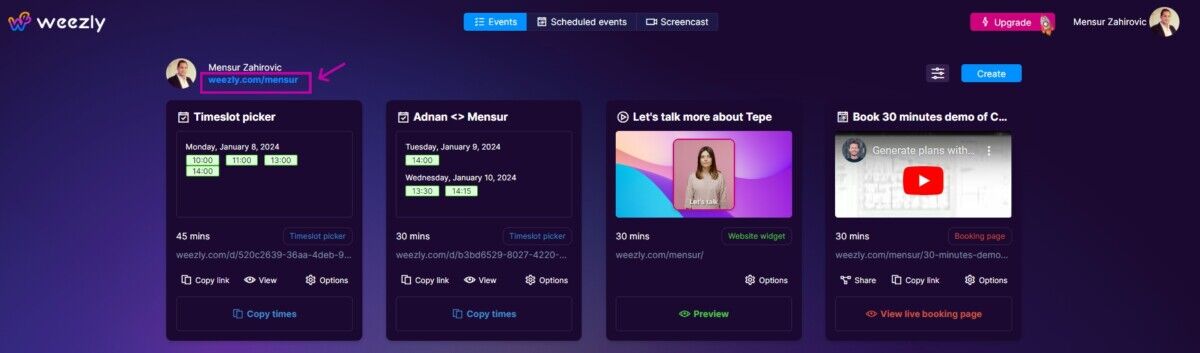 This will be the probably most used way for you to share things in Weezly, and it is to distribute your specific event link if you’d like your guest to schedule a particular event type. You can obtain it by clicking the “Copy” or “Share” buttons associated with your event types.