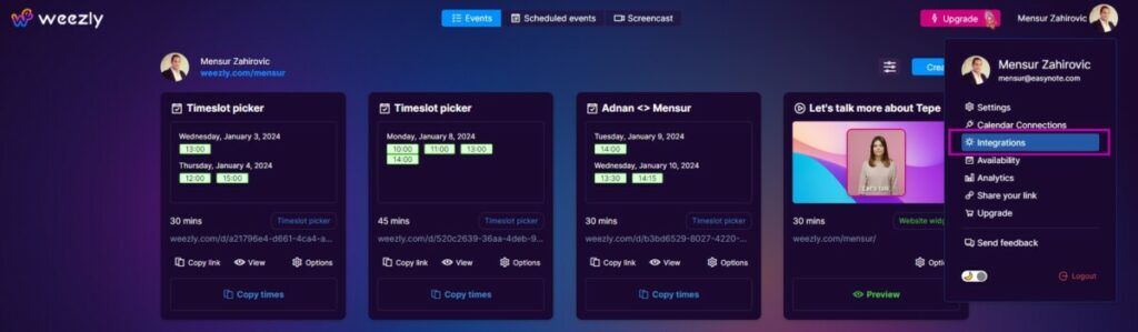 Log in to your Weezly account and click on the icon with your name and picture in the upper right corner.